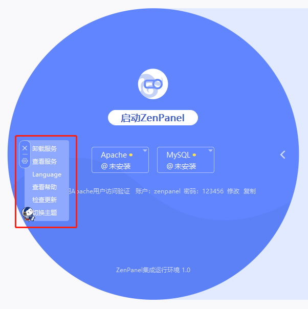 点击设置按钮,可以卸载服务、查看服务、设置语言、查看帮助、检查更新、切换主题操作。